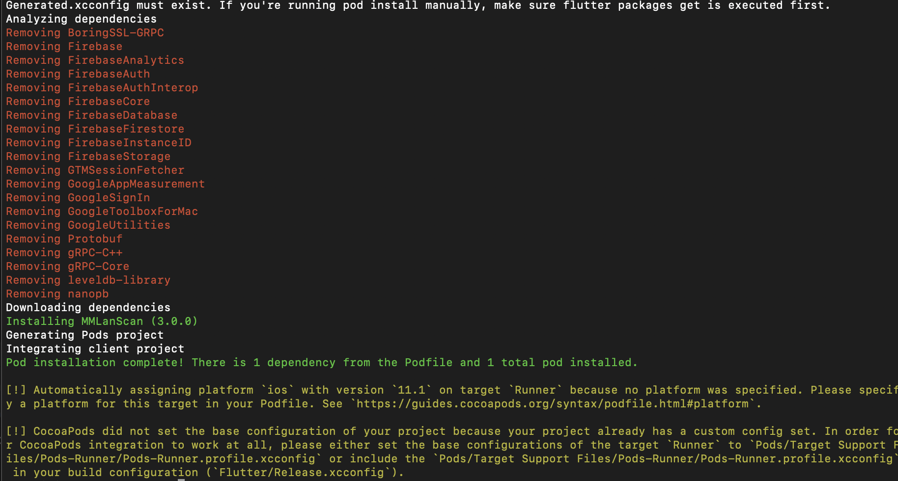 그 전에 내가 Flutter Plugin(Firebase, Firestore etc..)을 등록했었고, iOS에 대한 라이브러리도 Pods폴더에 들어가 있었는데 pod install 을 하니 전부 사라지고 내가 추가한 라이브러리만 남아있었다;;;