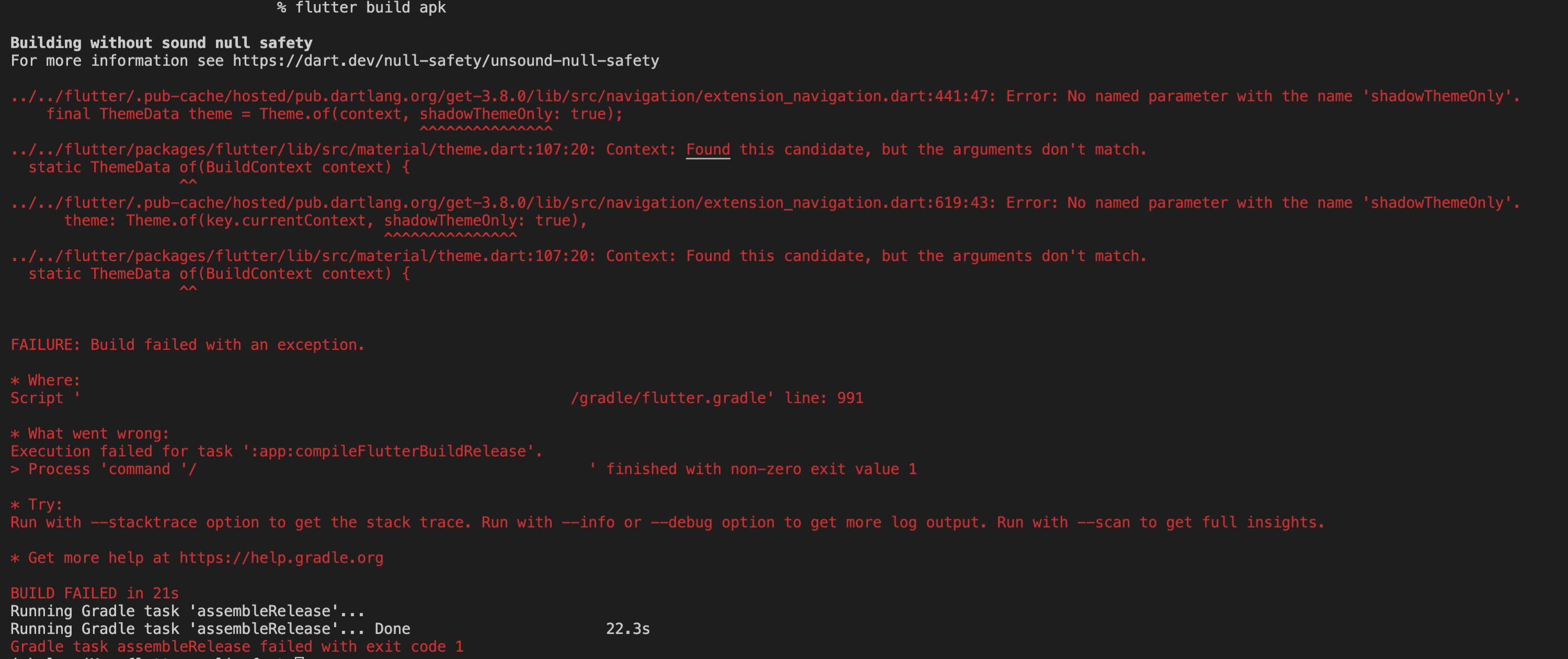 .pub-cache 내에 있는 package (위 스크린샷에서는 get-3.8.0) 에서 Theme 사용시 파라미터가 없다는 에러였다.